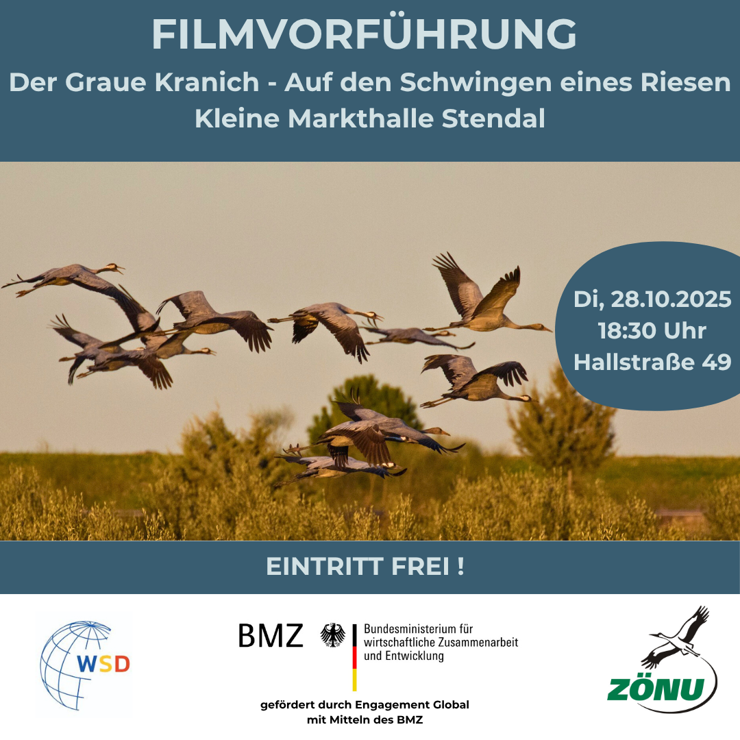 | Es ist Herbst und die Kraniche sind wieder da! Passend dazu zeigt das ZÖNU in Kooperation mit der Freiwilligen-Agentur Altmark in der Kleinen Markthalle am Dienstag, den 28.10. um 18:30 die Dokumentation „Der graue Kranich – Auf den Schwingen eines Riesen“. Dabei geht es um die abenteuerliche Reise des Grauen Kranich durch Europa. Der Eintritt ist kostenlos! ![]() |
